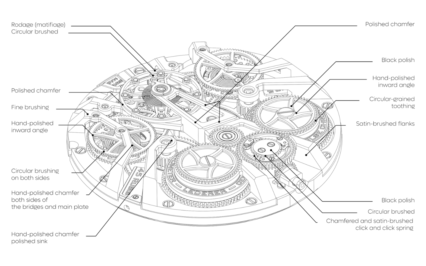 A variety of high-end watchmaking finishes have been meticulously applied, with hand bevelling, graining, frosting, satin-brushing and black polishing across an abundance of contrasting surfaces and features. The entire movement is designed, crafted and finished in-house.