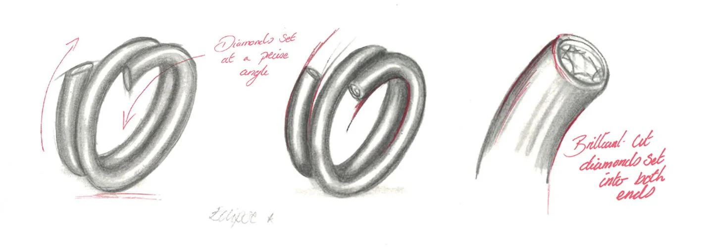 When the solution unexpectedly dawned upon him, Charlie immediately sketched it. The idea was to reduce the stack of smooth gold tubes that form the unique shape of the Pyramid ring to a minimalist single cylindrical band. This single tube, that would become the foundation of the collection, formed the Eclipse Spring Ring.