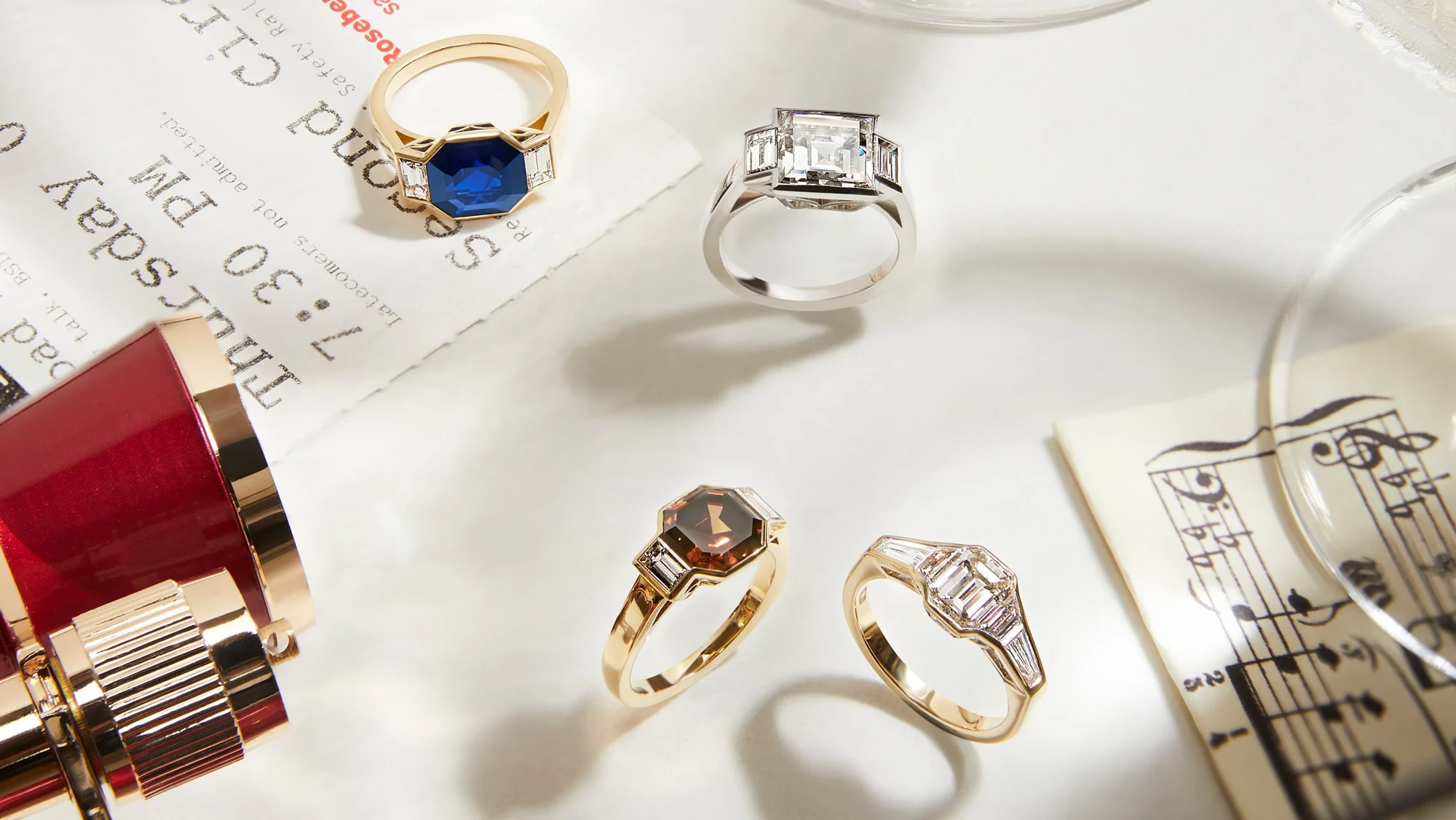 The step cut centre stones - whether the square shape of carré cuts or elongated baguette cuts - are accented with trapezoid and tapered baguette cuts, which have been set along the shoulders of the ring, ultimately creating the impression of a sheer surface of gems running across your finger.